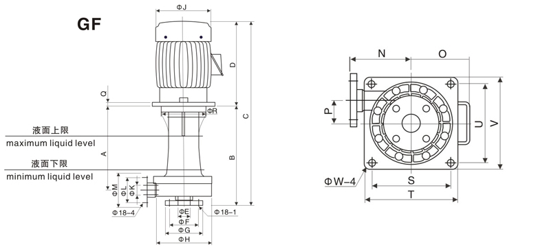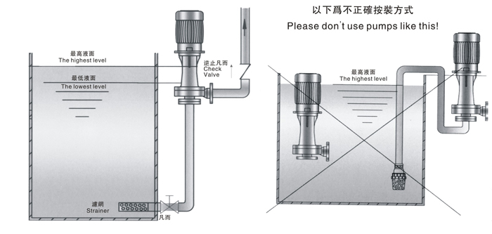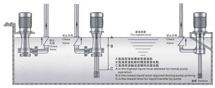 ·出口配管高度,如有高过马达以上或有逆压之情形时,请在泵浦出口处理装置逆止阀,装置位置请勿超过最高液面线太高。